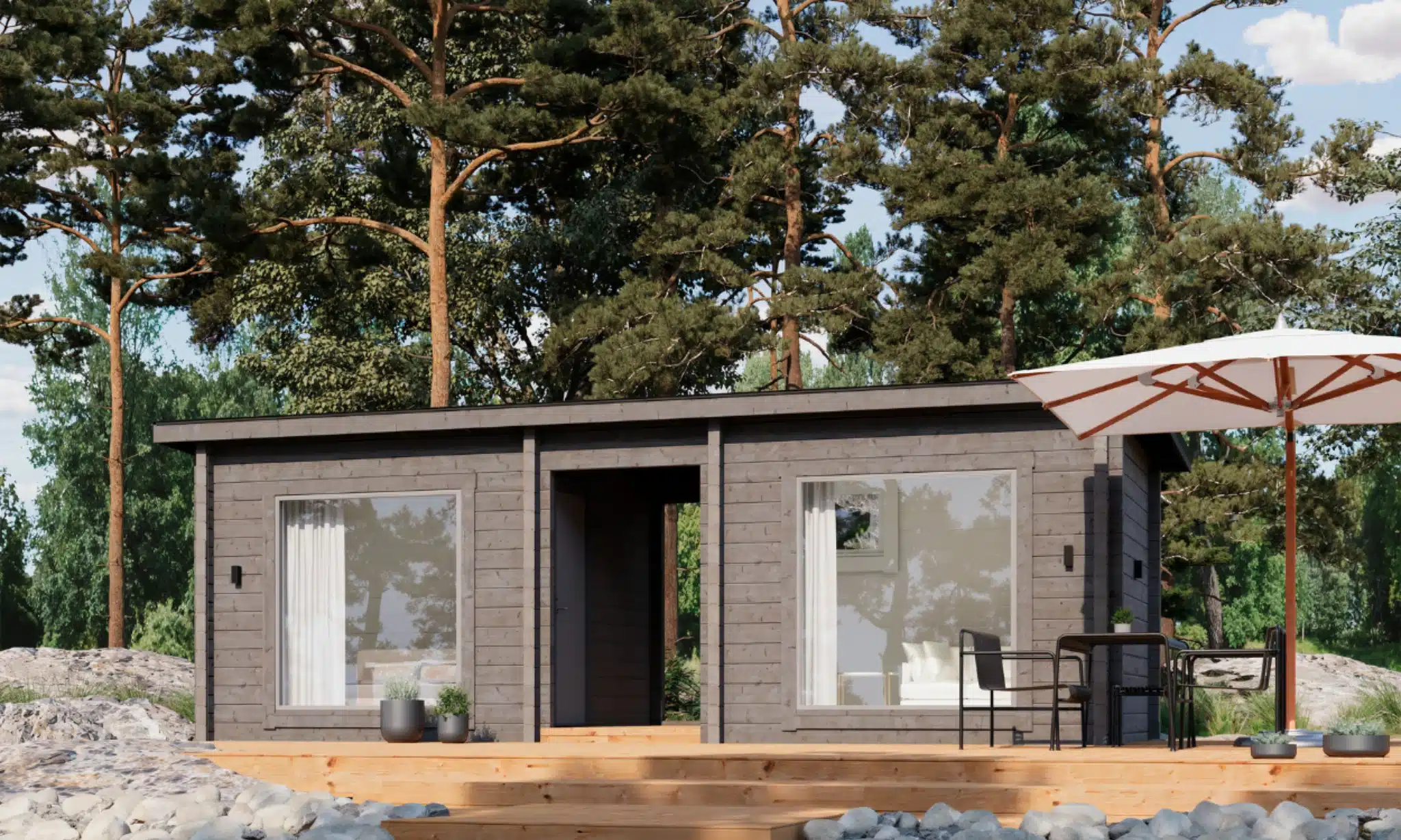 Suojaisan katetun terassin tarjoava hirsiaitta, jossa kaksi tilaa erillään toisistaan. Tilat sopivat monipuoliseen käyttöön niin työ- kuin makuuhuoneiksi. Terassi on oivallinen tila vaikkapa sadepäivän grillaukseen. Suuret ikkunat tuovat rakennukseen avaruutta ja runsaasti luonnonvaloa. Saatavana pulpetti- tai harjakattoisena.