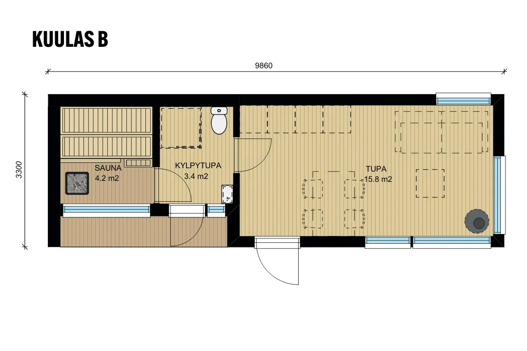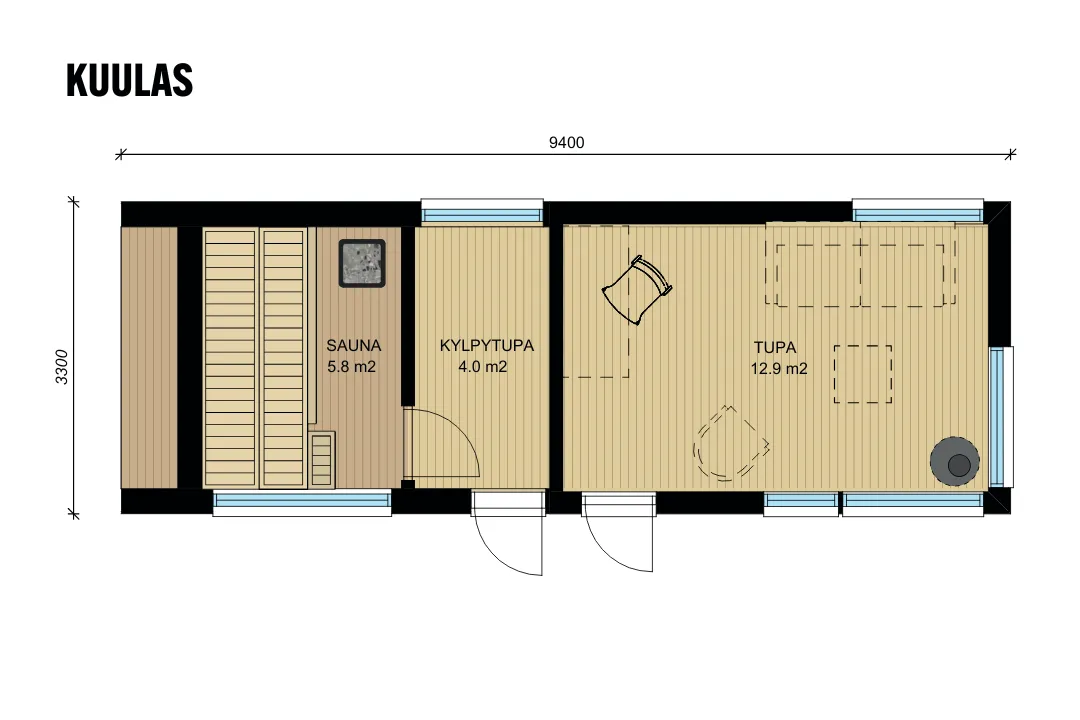 Käytännöllinen rakennus, jossa yhdistyvät sauna, Kylpytupa™️ ja tupa yhdeksi toimivaksi kokonaisuudeksi. Voit yhdistää saunamökin ja vierasmajoituksen yhteen kompaktiin rakennukseen. Tupa toimii monipuolisena oleskelutilana, jossa on täydelliset edellytykset rentoon ajanviettoon joko pienemmällä tai suuremmalla porukalla. Rakennuksen sivusta löytyy sisennys, jossa on mahdollista säilyttää esimerkiksi polttopuita. Kylpytupa™️ mahdollistaa kylpyveden saannin suoraan seinän läpi kiukaasta, jolloin erillistä pataa tai suihkua ei tarvita.