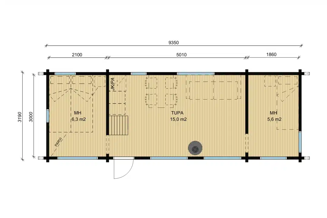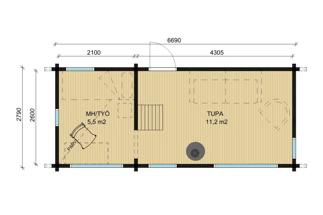 Aitta, joka sisältää parven. Parvi tuo hirsiaittaan enemmän mahdollisuuksia, toiminnallisuutta ja lisää tilaa ilman, että rakennuksen neliöitä tarvitsee kasvattaa. Ratkaisu hyödyntää huonekorkeutta ja tekee tilasta selkeämmin jaetun. Alataso voi jäädä esimerkiksi työtilaksi. Saatavana harjakattoisena.
