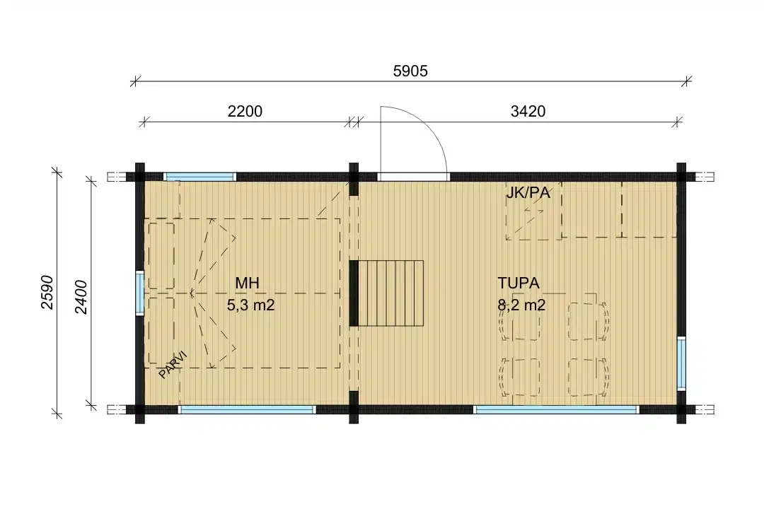 Tupa, kaksi makuuhuonetta ja parvi.