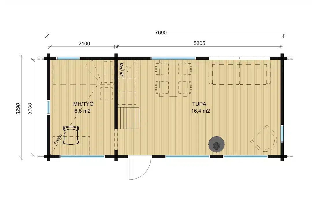 Tupa, makuuhuone ja parvi.